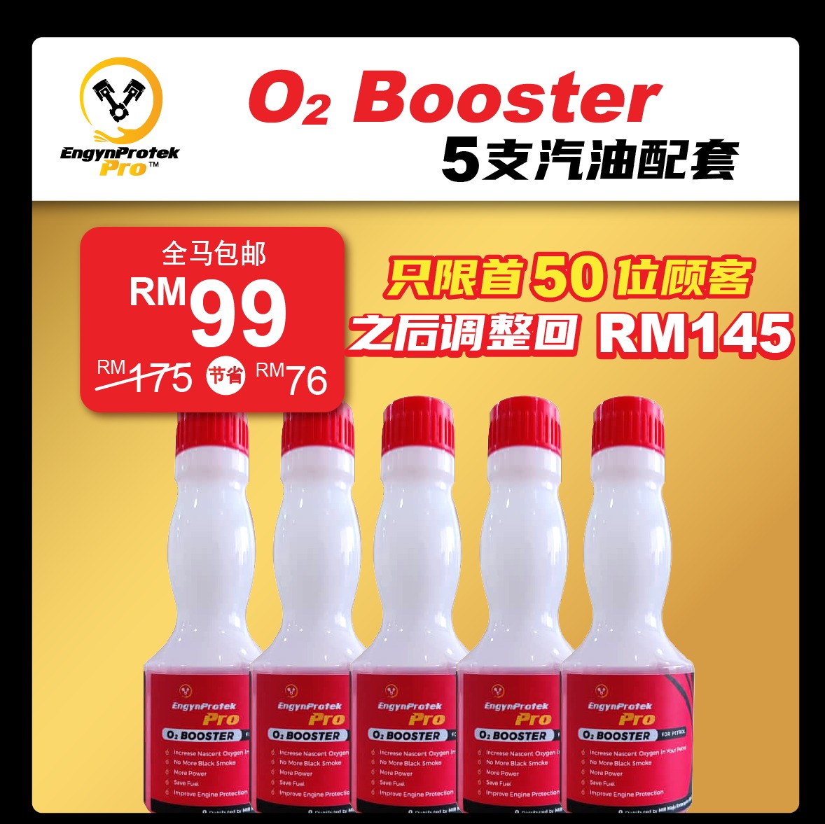 | Booster O2 【EngynProtek Pro O2 Booster 5Btl Petrol Package】5支配套汽油燃油宝 燃油添加剂 韩国配方【KOREA】 引擎更干净,省油,有力 消除积碳 拒绝阻塞 | | RM99.00 | |